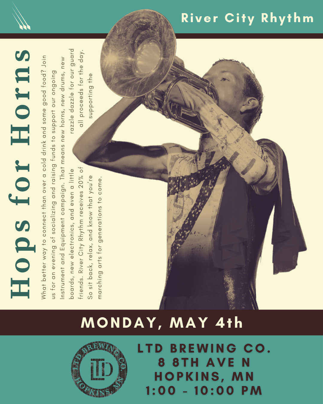 What better way to connect than over a cold drink and some good food? Join us for an evening of socializing and raising funds to support our ongoing Instrument and Equipment campaign. That means new horns, new drums, new boards, new electronics, and even a little razzle dazzle for our guard friends. River City Rhythm receives 20% of all proceeds for the day. So sit back, relax, and know that you’re supporting the marching arts for generations to come.
